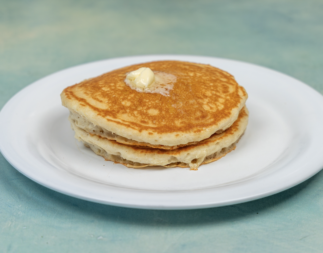 2 Golden Fluffy Pancakes add Bananas, Blueberries Strawberries, Chocolate Chips or Pecans, Bacon (2) or Sausage (1)