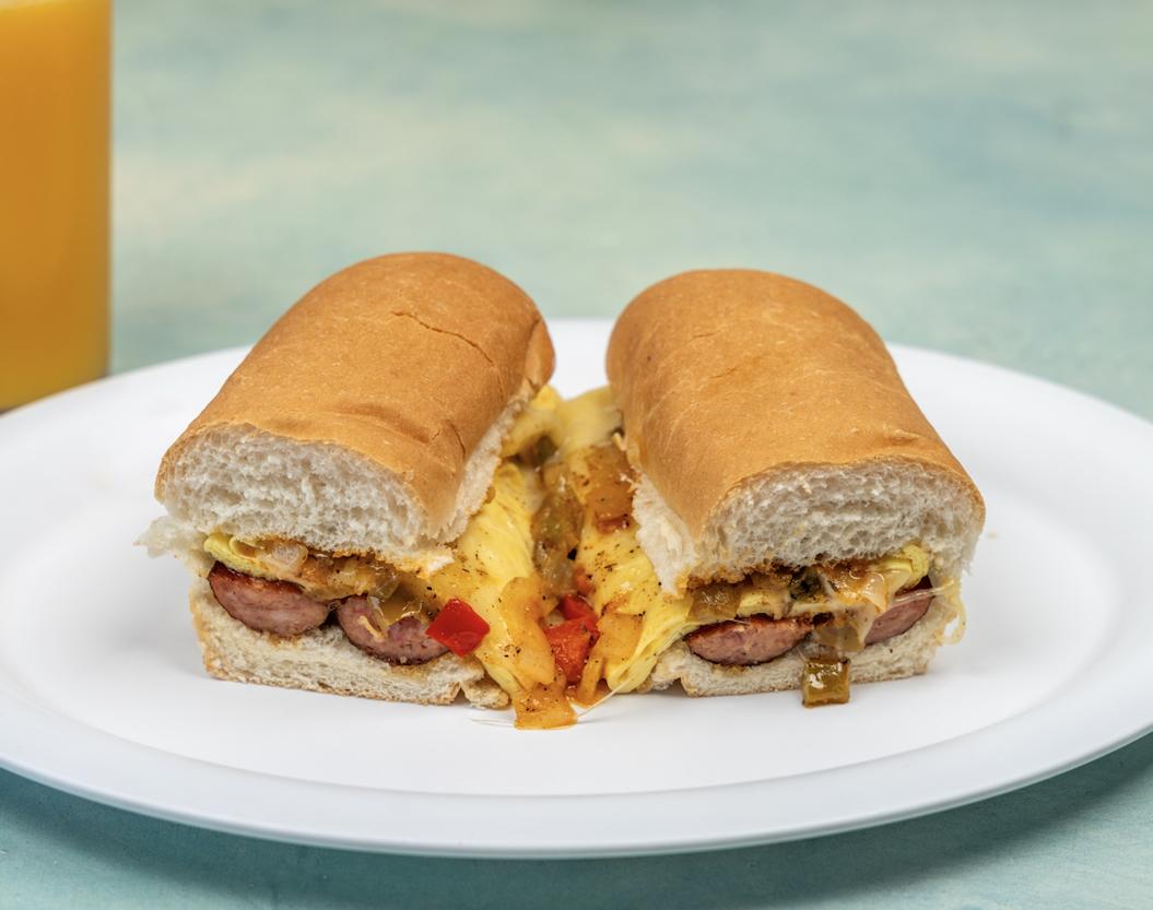The hungry man's breakfast sandwich, Azar's Andouille Sausage, Scrambled eggs with grilled peppers and onions on a fresh baked kaiser roll.