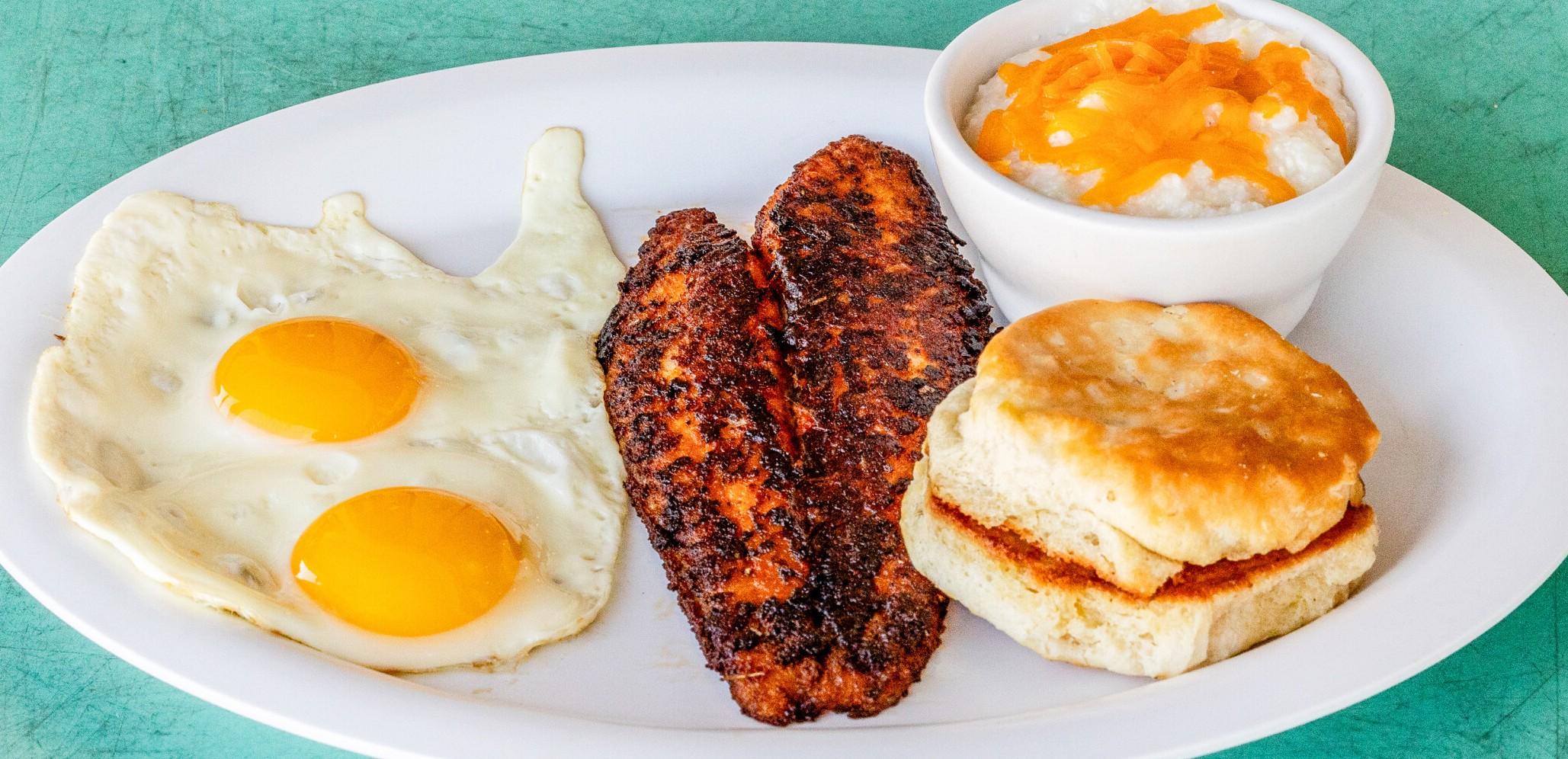 Two Eggs any style with 5-7oz. Swai Filet, Fried, Grilled or Blackened Served with choice of Potatoes or Grits, Toast or Biscuit
