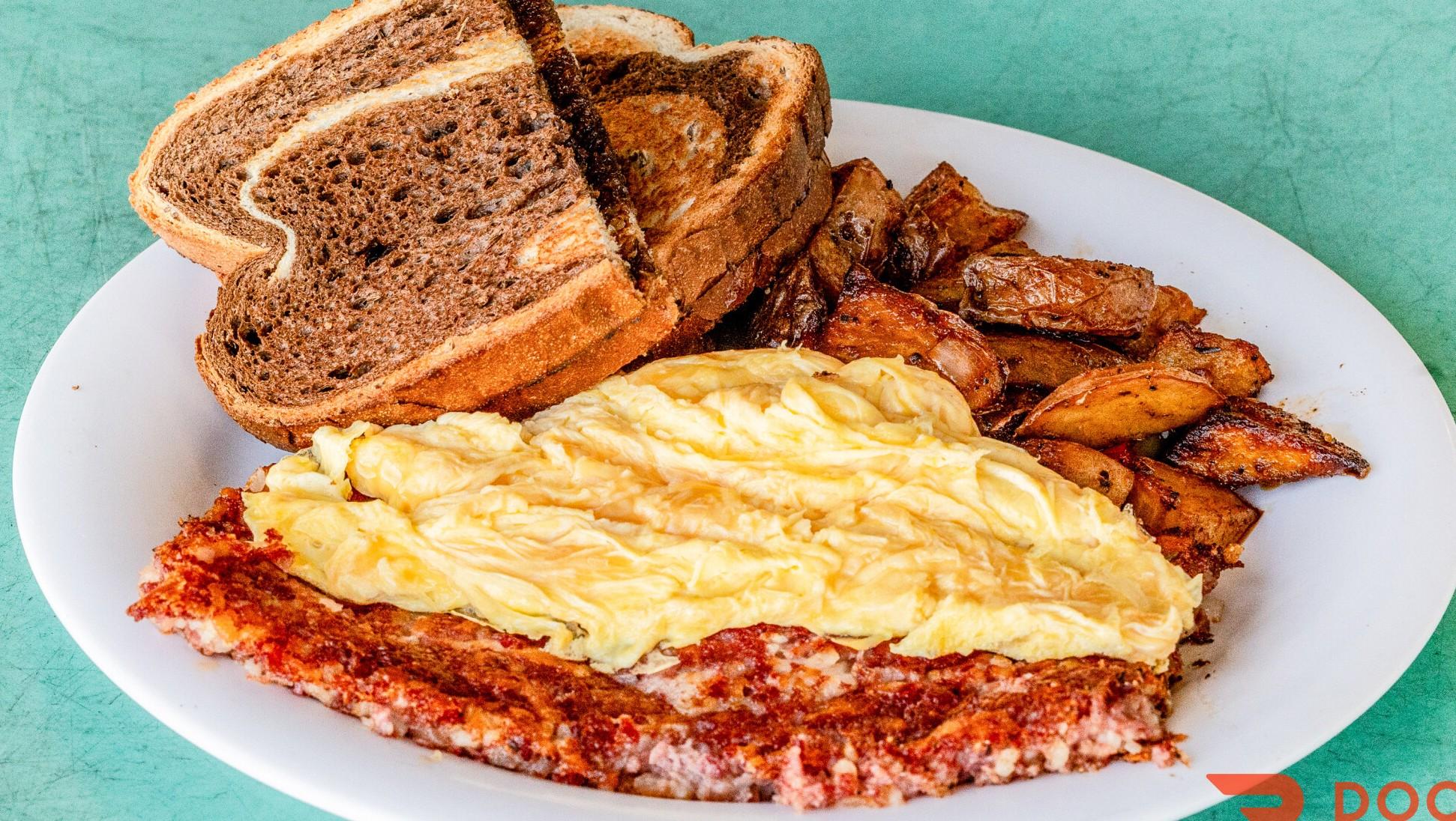 Corned Beef Hash, Two Eggs any style Served with Grits, Potatoes, Toast or Biscuit