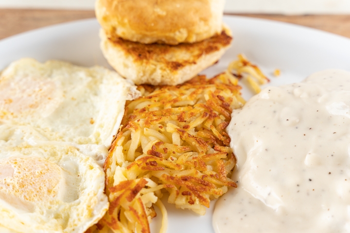 Sausage Gravy Over Biscuit with Hash Browns or Home Fries