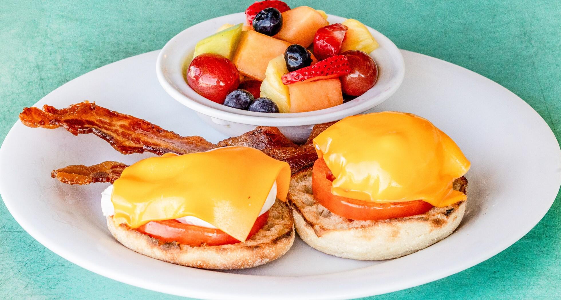 Two Poached Eggs on English Muffin, Tomato, American Cheese and Bacon Served with potatoes or grits