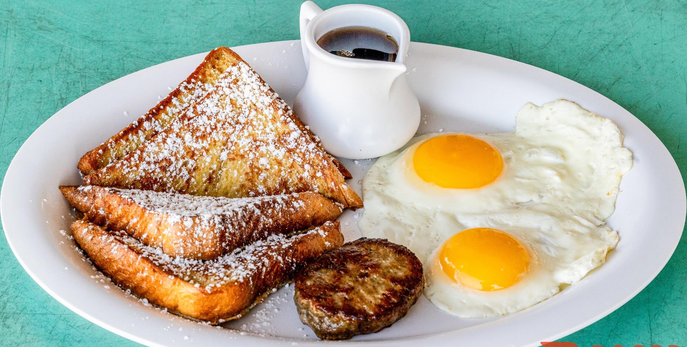 Two eggs cooked to order, a half stack of French Toast, and your choice of two bacon, a sausage link, or a sausage patty.