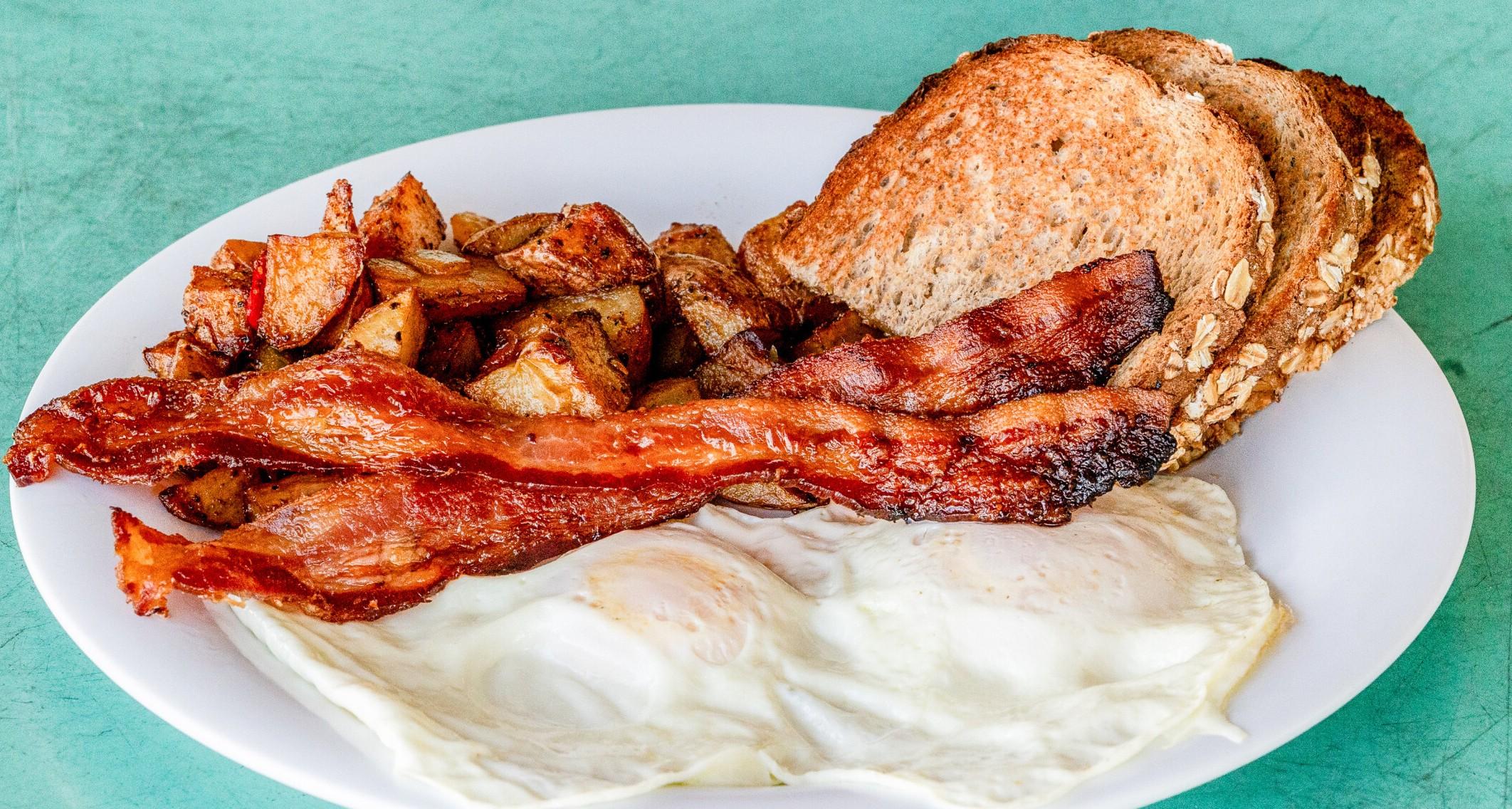 Two Eggs any style, Two Strips Bacon, Hash Browns or Grits, two slices of bacon or one sausage link, patty or turkey sausage patty, choice of Toast or Biscuit