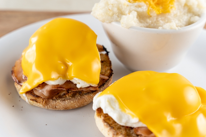 Toasted English Muffin with Poached Eggs, Canadian Bacon and Hollandaise Sauce Served with Potatoes or Grits